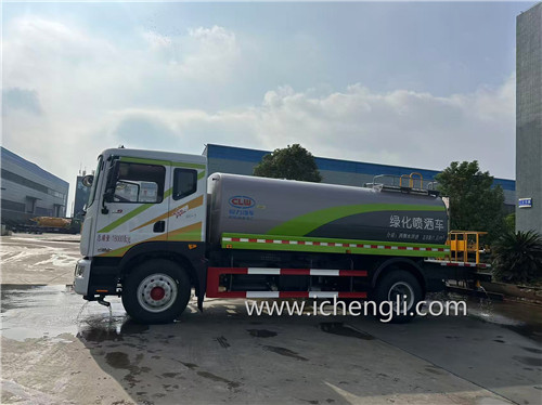 根据客户要求:罐体容积约14.3立方。新款工艺流水线标准化生产洒水车,大气,漂亮!专用功能为:前冲后洒,带侧喷,罐体后带工作平台,平台上安装绿化洒水高炮,洒水炮可全方位旋转,并有多种雨状可调节(大雨、中雨、毛毛雨、雾状),泵可自吸自排,带自流阀,带消防接头,带过滤装置。车辆交付客户特别满意!感谢信任!